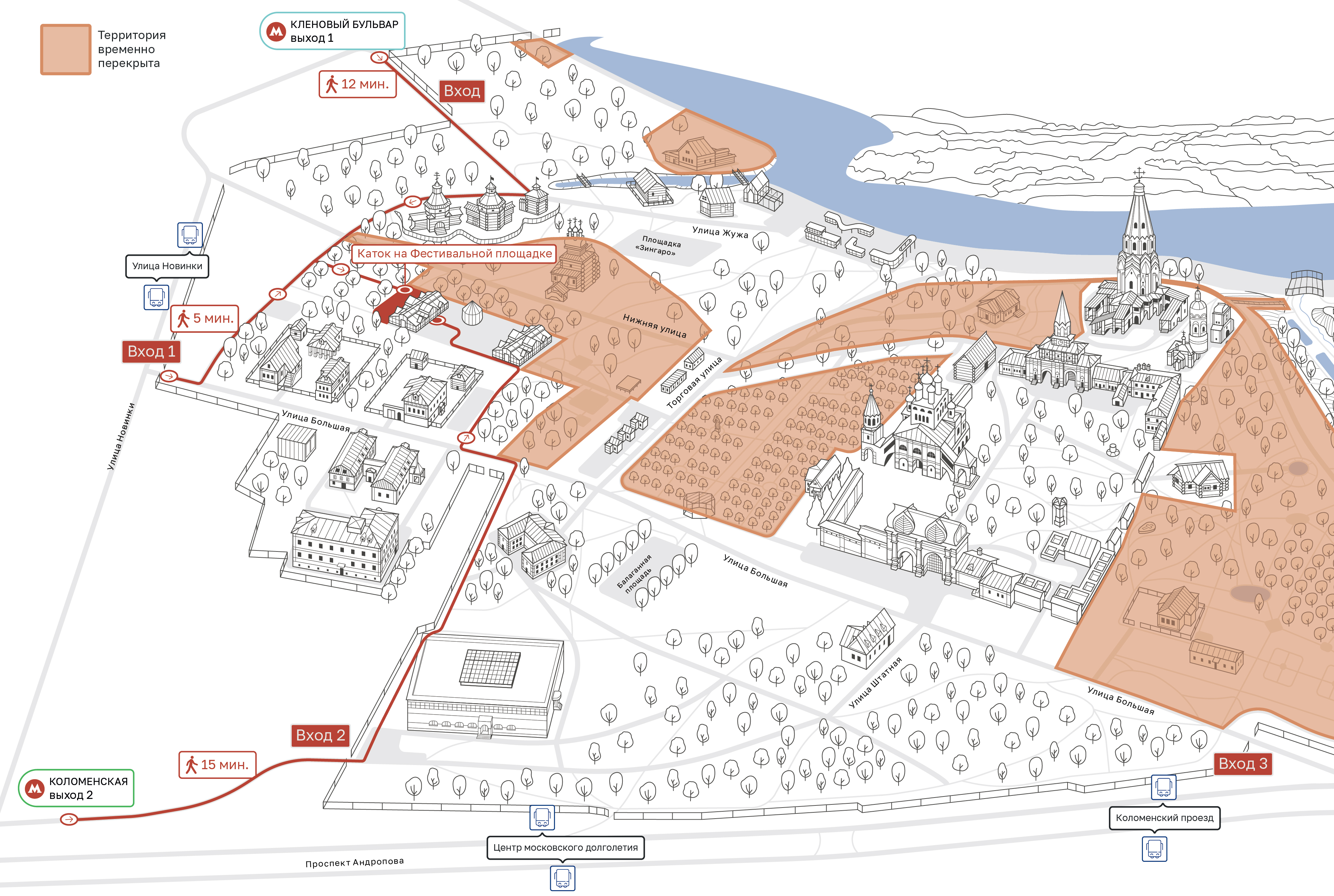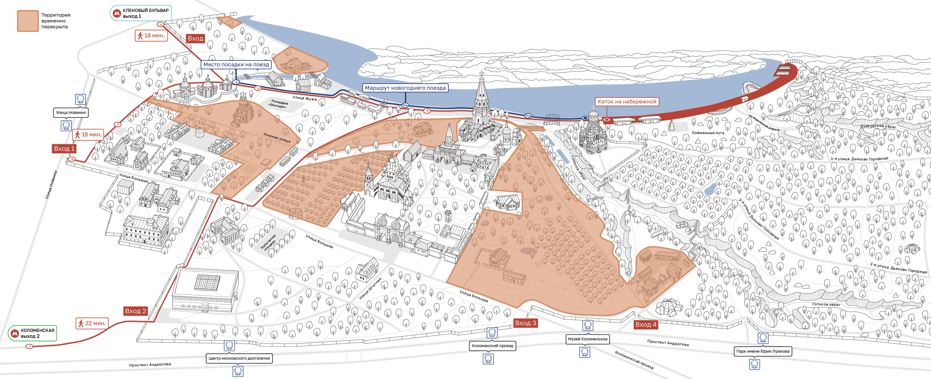 Новый каток в Коломенском — это не просто ледовая площадка, а масштабный маршрут для прогулок на коньках. Его общая площадь составляет 13 450 кв. метров, ледовая трасса проложена между Голосовым оврагом и южной частью набережной, а над всем маршрутом размещена гирлянда из более чем 14 миллионов ламп, которая по вечерам создает волшебный эффект звездного неба.