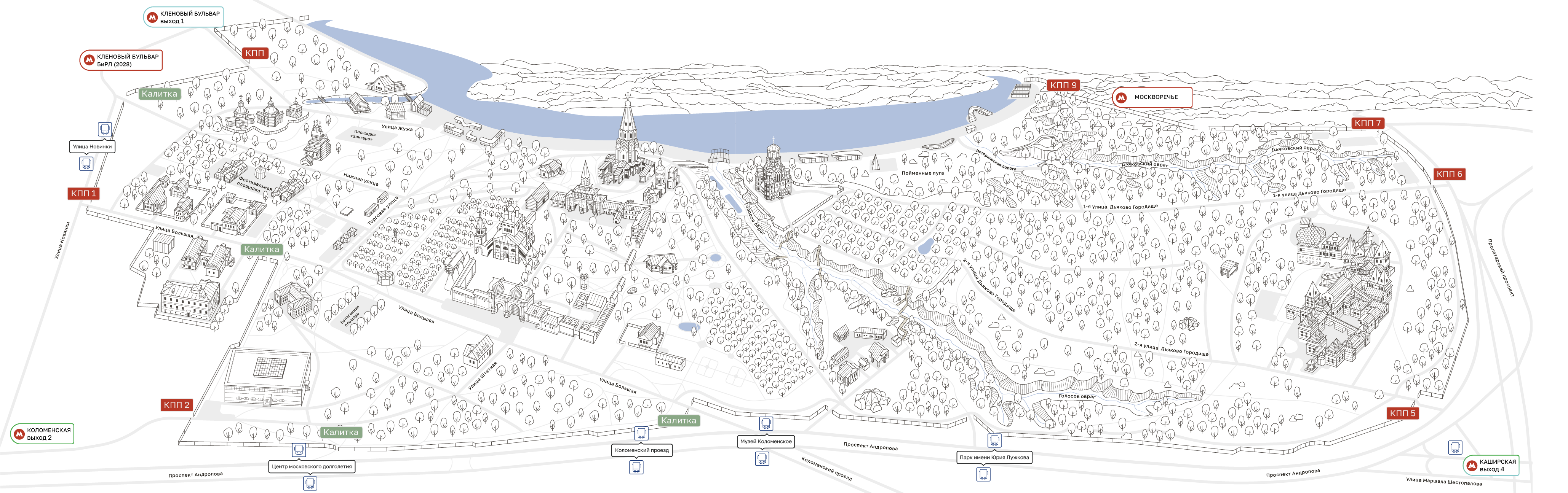 Для вашего удобства мы отметили на карте музея-заповедника все действующие и открытые для прохода калитки и КПП (посмотреть актуальные зоны благоустройства можно на этой странице).