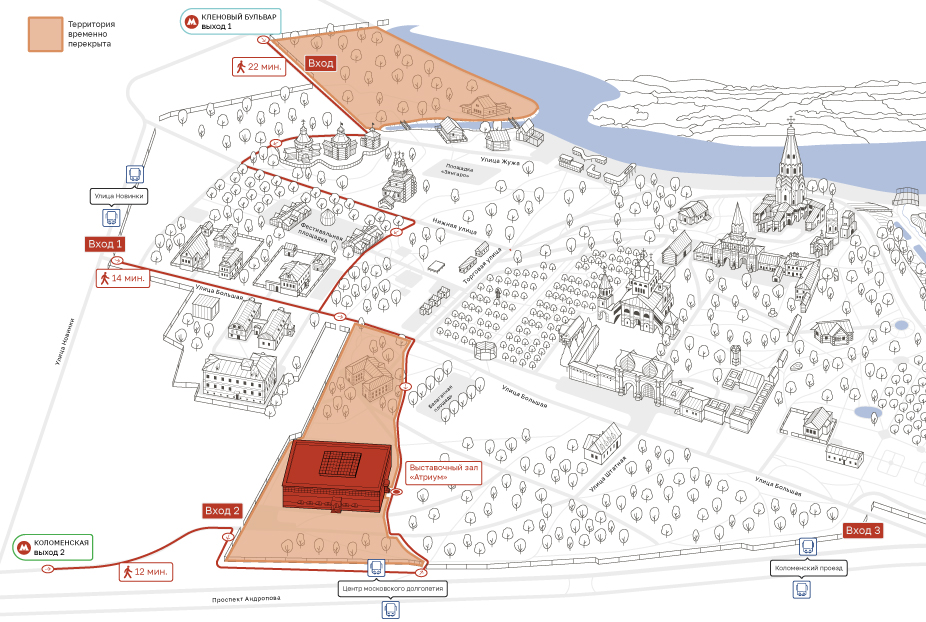 КоломенскоеУ входа в музей-заповедник со стороны станции метро «Коломенская» находится двухэтажное здание, которое совмещает в себе несколько функций. Здесь администрация Коломенского, а также музейные фонды и реставрационные мастерские. Экспозиция выставочного зала временно закрыта.